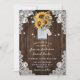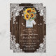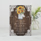 Una rústica invitación a una boda de girasoles campestres con un ramo de girasol dentro de un frasco de albañil contra un fondo de madera de granero adornado con encajes florales blancos y luces de cuerdas. Diseño de tarjetas perfecto para invitar a sus huéspedes a su fiesta de bodas de temática rústica inspirada en las flores de girasol. Diseño de personalizable completo.