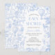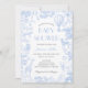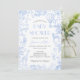 Elegante Baby Shower Invitation con toile azul de Jouy Floral, con un encantador tema animal de safari. Esta bonita invitación se caracteriza por un globo de aire caliente y por unos adorables animales de safari como una jirafa, un elefante, una cebra y un león, todo ello con un fondo de chinoiserie floral azul. Con su estética vintage y su elegante tipografía, esta invitación marca el tono para una celebración eterna. El personalizable es perfecto para una ducha de bebé de temática safari, mezcla encanto y sofisticación.