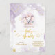 Invitación a la ducha con nene color agua violeta Rubor Pink Gold. Cute elefante, mariposa, corazones dorados y puntos alrededor, elegante guión manuscrito y fondo morado de color claro. El diseño es una mezcla de blancura, modernidad y elegancia. No olvides descubrir la colección completa.
