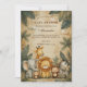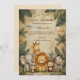 Welcome guests to a warm and whimsical celebration with this Safari-themed baby shower design. Featuring a sweet trio of jungle friends — a giraffe, elephant, and lion — framed by rich boho foliage, earthy neutrals, and soft natural textures.