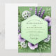 Evoke the serene beauty of a springtime field with this elegant botanical design. A soft sage green background provides a tranquil setting for a lush arrangement of purple and white anemones. Sprigs of delicate lavender and fresh greenery complete this romantic and naturalistic composition for your special day.