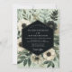 A captivating sage-green backdrop showcases delicate, muted florals with dark centers and airy eucalyptus leaves. The ethereal design evokes a sense of natural romance and timeless elegance, perfect for a serene wedding occasion.