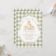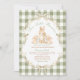Celebrate the sweet arrival of a little one with this sage green gingham baby shower invitation featuring a watercolor mommy and baby bunny, framed by soft florals, daisies, and ribbon accents.