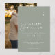 Esta invitación a una boda en un monograma minimalista verde sabio puede ser personalizada con su información en tipografía moderna y foto especial al revés. Diseñado por Thisisnotme©