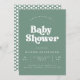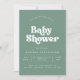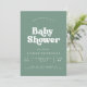 Una invitación a la moda para una ducha de bebé con el titular "baby ducha" de tipo retro blanco sobre un fondo verde azulado silencioso. Personalice sus datos en el tipo de letra sans serif en blanco. Al revés se ve un patrón de puntos de polka en blanco y verde azulado.
