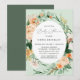 Hermosas invitaciones a la ducha de bebé con un elegante marco moderno y neutro de color pastel acuático con vegetación floral botánica en suaves tonalidades de tierra de melocotón, naranja, suave rubor, amarillos y muchos tonos verdes de verde salado a verde claro y más profundo. Sus detalles personalizados se muestran en una distribución tipográfica elevada que coloca al invitado de honor en el centro y frente.