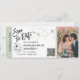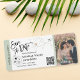 Destino Boda Boda Embarcadero Pasar Boleto Avión de oro Guardar la Fecha con icono de corazón y avión con línea simple de arte minimalista mapa del mundo y color de fondo verde sabio. Añadir su código QR