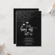 La moderna invitación a la fiesta de halloween "ven con nosotros" con dos arañas colgadas con su web puesta sobre un fondo negro azabache.