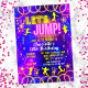 Saltemos la invitación a la fiesta de cumpleaños con luces de neón vívidas en azul y púrpura, y texto en rosa, blanco y amarillo, genial para un parque trampolín o una fiesta de cumpleaños en casa de rebote para chicas.