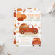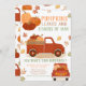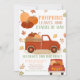 Prepárate para divertirte en otoño con esta adorable invitación a las calabazas y pilas de heno cumpleaños. Con un camión rojo brillante rebosante de calabazas, rodeado de coloridas hojas de otoño y pilas rústicas de heno. Este diseño captura perfectamente el encanto acogedor de una celebración de cumpleaños de otoño. Con un diseño festivo, es ideal para un fiesta de calabaza infantil, un bash en el patio trasero o cualquier evento de cumpleaños de otoño. BRT149