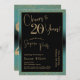 Utilizando dos tipos de letra distintivos, he creado gráficos para su invitación y los he embellecido con un efecto de oro falso metálico para una vibración festiva. Aunque cada parte se puede mover para adaptarla a sus necesidades, el encabezado dice "¡Saludos a 20 años!" y "Fiesta sorpresa". ("Sorpresa" se puede eliminar si su fiesta no lo es.) Todo el texto se colocó sobre un rectángulo negro que sobrepone un fondo verde azulado. Confeti dorado y una sutil sombra oscura negra completan el efecto fronterizo. ¡Cambia el color de fondo a lo que quieras! // 130 + 131 //