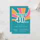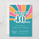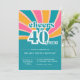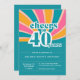 Añada una luminosa atmósfera de inspiración retro a su 40 cumpleaños con estas divertidas y coquetas invitaciones. Fácil de personalizar con todos los detalles del fiesta. Letras de época chunky con un fondo azul, amarillo y rosa colorido con el texto: "vítores a 40 años".