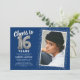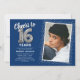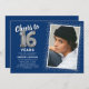 Celebra el gran hito de cumplir dieciséis años con nuestras elegantes invitaciones para fiestas de cumpleaños. Con un fondo azul a la moda en el personalizable, un lugar con fotos personales y acentos plateados, estas invitaciones dejan una impresión duradera. Los detalles del globo de helio plateado le dan un toque mágico, mientras que la plantilla de texto de 16 años es fácil de personalizar. ¡Porque el estilo no tiene límite de edad!