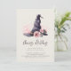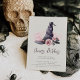 Organizar una noche de chicas espeluznantes o de mujeres con sus brujas favoritas. Esta espeluznante invitación a la fiesta de moda de Halloween incluye un ilustracion gorra de brujas acuarelas decorado con flores rosas y moradas. "Alegres, brujas" o tu elección de texto aparece debajo. Personalice esta invitación única de Halloween con los detalles de su fiesta.