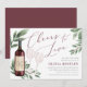 ¿Planear una copa de vino o una cata de vinos con ducha de novia, o organizar el gran evento en una bodega o viñedo? Invite a sus huéspedes con nuestras elegantes invitaciones a la ducha de novias con degustación de vino, con una botella de vino tinto y dos copas de vino y adornadas con hojas de eucalipto y follaje de color verde. "Saludos al amor" aparece en la escritura caligráfica de moda. Para terminar, personaliza la etiqueta de la botella con las iniciales de la pareja. Perfecto para las duchas de novios en el campo vinícola, bodega o viñedos.