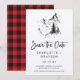 Salvaje Rústico Montaña Cuadrada Ahorra la Fecha - Nuestra plantilla de salva la fecha de montaña rústica presenta una majestuosa montaña ilustrada a mano y árboles de hoja perenne con tipografía de estilo de letra a mano. La parte trasera de la invitación es trendy, cuadros de búfalo rojos y negros. Se muestra en papel Kraft rústico, sin embargo, puede elegir el papel que prefiera.