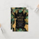 Celebra el primer cumpleaños de tu pequeño salvaje con esta invitación temática de safari en la jungla, con animales de Relieve metalizado de imitación dorados (jirafa, león y monos), follaje de oro y selva verde, y una rociada de confetti de oro sobre un fondo negro. Añada el nombre y los detalles del fiesta de su hijo en blanco y dorado. Un patrón coordinado de follaje de jungla en verde y oro sobre fondo negro decora la parte trasera de la tarjeta.