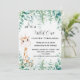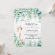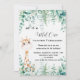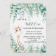 Para el primer cumpleaños del bebé. Un fondo blanco, una tierna jirafa y eucalipto verde y helechos de bosque. Personalice y agregue el nombre y los detalles del fiesta. Texto: Salvaje uno