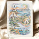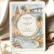 This destination wedding invitation celebrates San Diego with a dynamic fine-art watercolor illustration that wraps completely around the design. The front features key city icons—Balboa Park tower, palm trees, the Coronado Bridge, dramatic ocean cliffs, playful sea lions, and the downtown skyline—framed by flowing, Art Nouveau–inspired swirls. Soft washes of peach, aqua, seafoam, and sunlit gold blend into one another, giving the artwork an airy, coastal glow while still feeling refined and elegant.