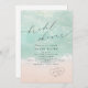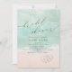 Hermosa acuarela turquesa y abstracta que resalta la ola del océano y los corazones en el fondo de la playa de arena, coronados por un guión elegante y un elegante estilo serif, moderno y sencillo. Gran invitación para la ducha de bodas náuticas en la playa, boda de destino tropical, ducha de novia con temática oceánica en verano.