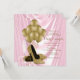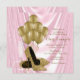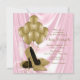 Invitación a la fiesta de cumpleaños de las mujeres en satén rosa y dorado con hermosos zapatos altos de tacón purpurina de oro, globos dorados, champán y perlas con fondo de satén rosado. Esta elegante invitación a la fiesta de cumpleaños rosa y dorado se personaliza fácilmente para tu evento, simplemente añadiendo tus detalles en el estilo de letra y color, la redacción y la disposición de tu elección. También puedes mover o borrar el champán y los globos. Se trata de un diseño impreso sin joyas, perlas, purpurinas, etc.