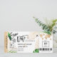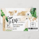 Destino Bodas de Playa Pase de Abordar Ticket Dorado Avión Save the Date con corazón e icono de avión con hojas tropicales