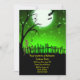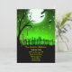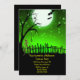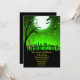 Un esqueleto aterrador que camina en un patio de tumbas con luna llena y fondo de cielo verde. Diseño muy divertido y aterrador para tus invitaciones a la fiesta de Halloween.