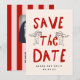 A playful and modern save the date card featuring your own photo and a customizable QR code.