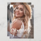 Esta elegante y moderna invitación a la fiesta de graduación incluye dos fotos del graduado. En el frente hay un moderno guión blanco informal junto con el nombre del graduado, la escuela y el año de clase. En la parte trasera hay una segunda foto descolorida del graduado con toda la información de su fiesta claramente impresa en un superpuesto. Una elegante y sencilla invitación a graduarse que resaltará las fotos personales favoritas de tu graduación!