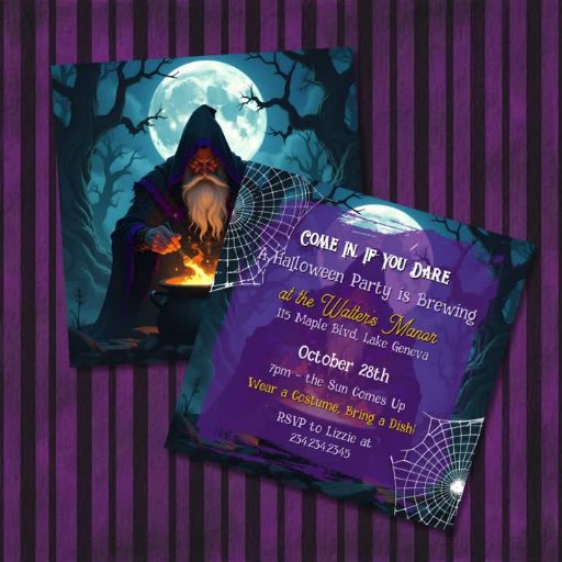 Una invitación personalizada de Halloween para tu fiesta con temas de bruja. ¡Se está preparando un fiesta! Una bruja peluda mezclando una poción en su caldero para la perfecta celebración de Halloween.