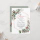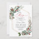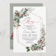 Con un sofisticado marco geométrico dorado adornado con exuberante vegetación acuática y bayas rojas festivas, este diseño combina elegancia y alegría de temporada. El audaz guión rojo "Merry" añade un toque llamativo pero refinado, haciendo de esta invitación ideal para duchas de novias con temática invernal / Navidad.