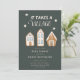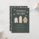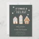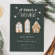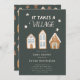 Rústica y moderna Navidad tema ducha de bebé para un niño con ilustracion a mano de casas de jengibre con heladas azules. El texto dice "se necesita un pueblo".