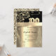 Secuencias de oro, vestido, copa de champán, botella y flores sobre fondo negro y dorado.
