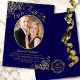 Esta hermosa invitación a la fiesta de renovación de votos/aniversario incluye un elegante título de escritura que dice "Todavía lo hacemos". Tiene un diseño simple y elegante con lujosas letras de guiones dorados en un fondo azul marino, y tu foto en un marco ovalado rodeada de adornos de Relieves metalizados falsos dorados. Gran manera de invitar a tu familia y amigos a celebrar tu amor.