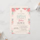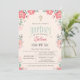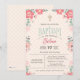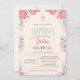 Crema, rosa suave, rosa coral y verdes suaves añaden un hermoso esquema de color floral a esta invitación. Adornada con una cruz.