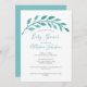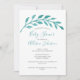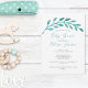 Una bonita colcha verde azulada de hojas sobre el título del evento y el nombre de la madre embarazada en esta sencilla y elegante invitación a bañarse en una ducha de bebé. Esta encantadora invitación botánica turquesa es minimalista y elegante por su ubicación junto al mar. La elegante tipografía le da un toque de moda para una ocasión insular en verano.