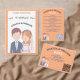 La invitación a la boda incluye un ilustracion encantador de una novia y un novio. El novio está representado con el pelo castaño corto, un cutis claro, y lleva una chaqueta azul marino sobre una camisa azul claro y una corbata blanca. Él tiene un pequeño boutonniere fijado a su solapa. La novia está parada a su lado, sonriendo dulcemente. Tiene el pelo ondulado, de naranja rojizo, adornado con una flor corona de flores rosas, naranjas y flores blancas. Un delicado velo blanco corre detrás de ella. Ella lleva puesto un vestido blanco boda con un collar de enamorados y perlas. Este simple ilustracion de tipo personalizado sugiere una conexión amorosa de cuerdas entre ellos. Es caprichoso y entrañable, dando un tono alegre para el próximo boda. El texto de la invitación se mantiene lo más mínimo posible para una sensación general simple donde el amor es el único elemento importante. Todos los campos son completamente personalizable. Puede dejar vacíos los campos que no desee utilizar (por ejemplo, el rsvp si prefiere una tarjeta separada)
