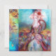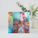 Diseño elegante, colorido, con clase y caprichoso en colores brillantes, fucsia, turquesa, azul turquesa, blanco. Hermosa y sofisticada mujer rubia blanquecina, telas doradas brillantes azules y rosadas de un traje barroco con plumas y una rosa roja. Pintura original en acuarela y acrílico con lámina dorada y colores iridiscentes en lienzo. Esta tarjeta genial y artística es perfecta para bodas, ceremonias nupciales, fiestas de soltera, dulces 16, fiestas de cumpleaños de quinceañera, bailes de disfraces, compromisos románticos, anuncios de "save the date", oficina de Navidad, reuniones familiares, cócteles, celebraciones de Nochevieja, aniversarios, reuniones, conciertos, recitales o casi cualquier evento que desees.