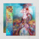 Diseño elegante, colorido, con clase y caprichoso en colores brillantes, fucsia, turquesa, azul turquesa y blanco. Hermosa y sofisticada mujer rubia blanquecina, telas azules y rosadas con brillo dorado de un traje barroco con plumas y una rosa roja. Pintura original en acuarela y acrílico con lámina dorada y colores iridiscentes sobre lienzo. Esta tarjeta genial y artística es perfecta para bodas, ceremonias nupciales, fiestas de soltera, dulces 16, fiestas de cumpleaños de quinceañera, bailes de disfraces, compromisos románticos, anuncios de "save the date", oficina de Navidad, reuniones familiares, cócteles, celebraciones de Nochevieja, aniversarios, reuniones, conciertos, recitales o casi cualquier evento que desees.