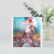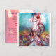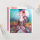 Diseño elegante, colorido, con clase y caprichoso en colores brillantes, fucsia, turquesa, blanco. Hermosa y sofisticada mujer rubia blanquecina, telas doradas brillantes azules y rosadas de un traje barroco con plumas y una rosa roja. Pintura original en acuarela y acrílico con lámina dorada y colores iridiscentes en lienzo. Esta tarjeta genial y artística es perfecta para bodas, ceremonias nupciales, fiestas de soltera, dulces 16, fiestas de cumpleaños de quinceañera, bailes de disfraces, compromisos románticos, anuncios de "save the date", oficina de Navidad, reuniones familiares, cócteles, celebraciones de Nochevieja, aniversarios, reuniones, conciertos, recitales o casi cualquier evento que desees.