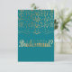 Este es un elegante y glamoroso confetti de Relieve metalizado de oro falso "¿Serás mi dama de honor?" Invitaciones a una dama de honor sobre un fondo verde azulado de la bahía de Vizcaya. Es un diseño muy clásico y sofisticado para los futuros novios que quieren que sus damas de honor se sientan especiales y amadas. Personalice con su propio mensaje y monograma en la parte posterior. Todo el diseño de impresión fotográfica.