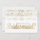 Este es un elegante y glamoroso confetti de Relieve metalizado de oro falso "¿Serás mi dama de honor?" Invitaciones a la dama de honor. Es un diseño muy clásico y sofisticado para los futuros novios que quieren que sus damas de honor se sientan especiales y amadas. Personalice con su propio mensaje y monograma en la parte posterior. Todo el diseño de impresión fotográfica.