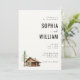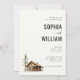 This elegant wedding invitation features a serene and inviting design with a vertical layout, showcasing a rustic log cabin illustration beside an evergreen tree. The color palette is composed of soft earthy tones on a light beige background, creating a classic and understated look. Serif fonts are used for the text, providing a sophisticated touch while allowing customization for names, dates, and locations. The overall mood is calm and welcoming, perfect for celebrating an intimate gathering in a natural setting.