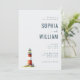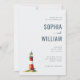 This elegant wedding invitation features a minimalist layout with ample negative space, creating a serene and inviting atmosphere. The design showcases a charming watercolor lighthouse illustration in red, white, yellow, and green hues, adding a touch of whimsy to the modern aesthetic. The typography is clean and sophisticated, with bold sans-serif fonts for names and a mix of serif styles for additional details. Perfect for couples seeking a stylish yet understated look, this invitation captures the essence of a coastal theme while maintaining an airy and open feel.