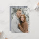 This wedding invitation features a cozy winter scene with a couple embracing in a snowy forest, creating an intimate and serene atmosphere. The design showcases a harmonious color palette of cool whites and grays from the snow, contrasted by warm browns and soft beiges from their clothing. Captured in a realistic photographic style, the layout centers on the couple, surrounded by dense evergreen trees that enhance the wintry theme. Perfect for celebrating love during the holiday season, this invitation evokes tranquility and affection through its natural beauty and genuine moment depiction.
