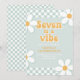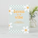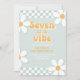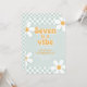 Seven es una invitación de cumpleaños número 7 inspirada en Groovy Girl Retro con fuentes estilo 70's, margaritas y patrón de cuadros.