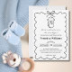 ¡Celebra tu pequeña en el camino con esta elegante y personalizable invitación a bañarse con un bebé neutro! Este moderno diseño blanco y negro presenta un ilustracion de arte de línea simple de un bebé envuelto en una manta en la parte superior, enmarcado con un elegante arco negro y un borde de cuerda para un toque moda, elegante y atemporal. Esta moderna ducha de bebé es perfecta para los padres que aman el diseño limpio con un toque de elegancia. Ya sea que usted esté organizando una reunión clásica, un brunch de moda o una moderna ducha mixta, esta invitación marca la pauta para una celebración que recordar. ¡Personalice hoy y cree un aguijón que sea tan hermoso como el día que compartirá con sus seres queridos! Busque nuestra colección para coordinar productos. El diseño es derechos de autor en diseños de estilo LLC.