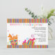 Un diseño festivo con coloridos bordes de rayas superiores e inferiores y regalos de cumpleaños envueltos en la coordinación de envoltura de regalo. Las palabras "Shh... es una sorpresa" están preimpresas.La tarjeta es fácil de personalizar con su redacción, fuente, color de fuente y elección de seis tipos de papel.