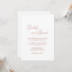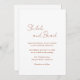 Invitación de boda moderna con un diseño sencillo con sus nombres en un guión elegante junto con los detalles de su evento en cobre sobre un fondo blanco. La plantilla incluye un campo para obtener detalles adicionales en la parte posterior o puede eliminar el texto para dejar el texto en blanco. Este diseño mínimo, monocromático, de un color de cobre profundo / óxido, funcionaría bien para un boda otoño/otoño. Si lo prefiere, puede cambiar los colores de la herramienta de edición de diseño.