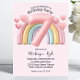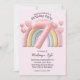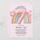 A custom birthday party invitation for an 7 year old girl featuring cute rainbow theme on a soft pink background. An image of a 3D balloon style, pastel pink number "7" is placed over a cute chubby and shiny rainbow. Cute little hearts accent the area.